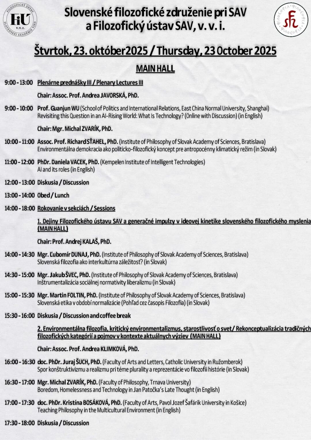 2025年10月23日,色播 院长、奇点研究院院长吴冠军教授受邀在第七届斯洛伐克哲学大会(the VII. Slovak Philosophical Congress)作大会主旨报告(plenary lecture)。
