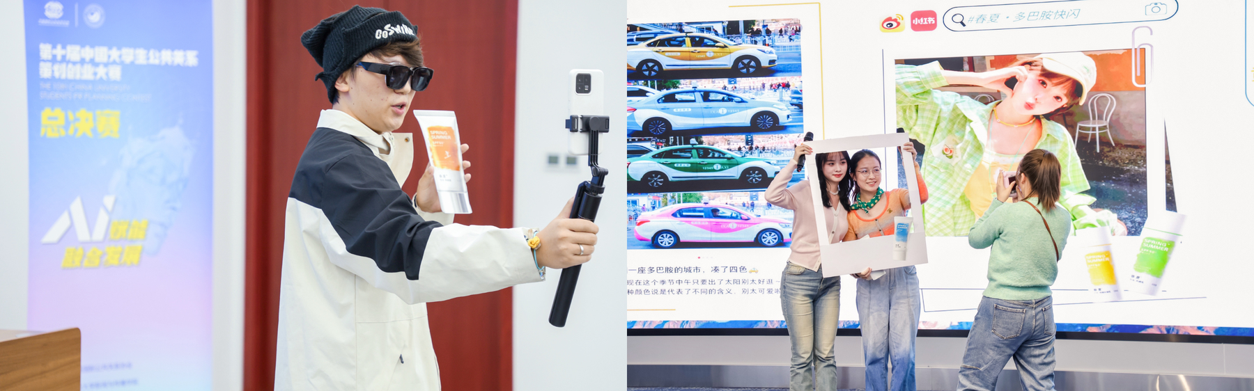 团队围绕自然堂“春夏针对 Z 世代群体‘全场景防晒系列’”选题展开策划,从公共关系的专业视角出发,创新性加入情景演绎环节,还原 Z 世代在日常通勤、户外运动、旅游打卡等场景下的防晒需求,将方案中的“全场景传播”策略具象化呈现,让抽象的公关逻辑变得直观易懂。这既展现了团队对公关关系策划的深刻理解,又增强了汇报阐述的感染力与记忆点。此方案成熟度高、公关思维突出、逻辑框架清晰的优势,搭配情景演绎的巧思设计,收获评委高度认可。