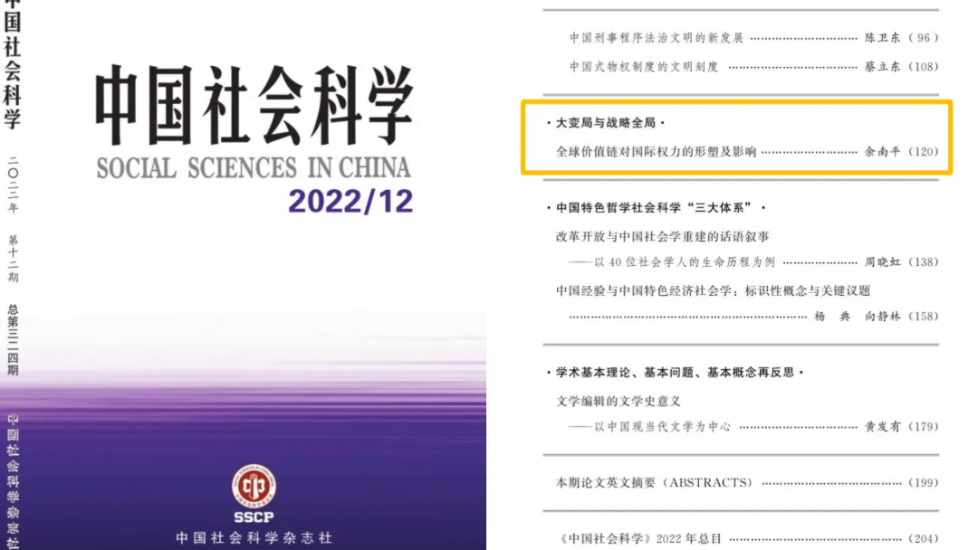 余南平教授的获奖成果《全球价值链对国际权力的形塑及影响》发表于《中国社会科学》2022年第12期(本公众号曾转载推介)。本文系国家社会科学基金重大项目“全球价值链与新型国际关系构建研究”(以免予鉴定方式结项)的阶段性成果之一。先后被《高等学校文科学术文摘》2023年第2期全文转载;被世界经济年鉴编辑部评选为“2022年国际政治经济学最佳论文TOP10”;荣获中国马克思主义研究基金会第八届“马克思主义研究优秀成果”二等奖;受《中国社会科学报》作者访谈栏目——「我说」之邀,与观众畅谈解说此文;成果还多次被权威知名学者引用、被主流媒体转载。